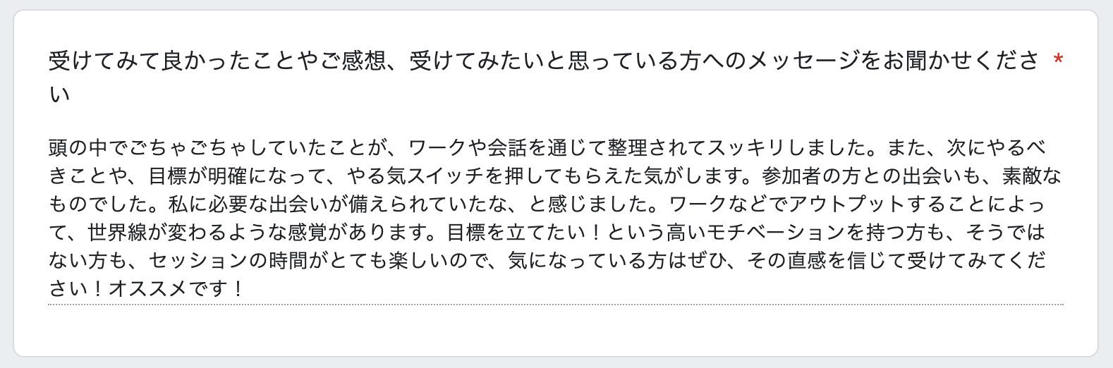 シェアすることに抵抗を感じられる方がいらっしゃるかもしれませんが、誰かに話すこと(言語化)によって、自分の考えがまとまっていき、明確な意図設定へと繋がっていきます。